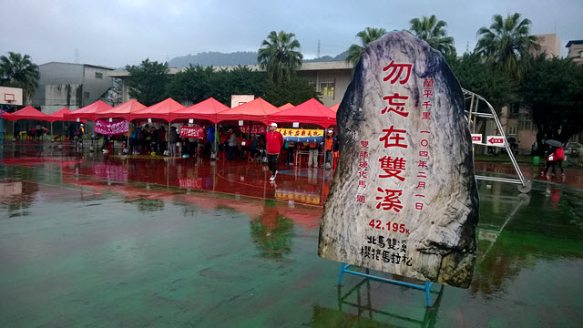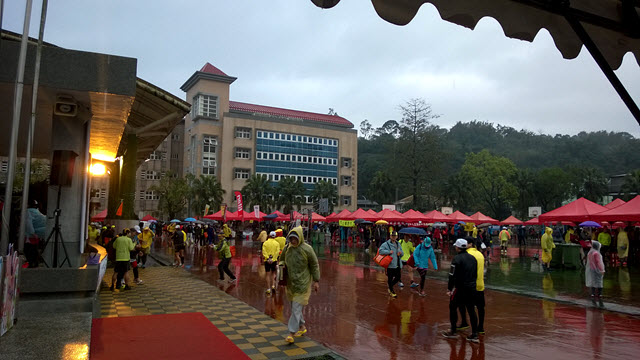 7點左右到達會場,雙溪高中,寄物處設在體育館內,空間廣大又不淋雨,很棒的規劃。等待起跑期間雨勢時大時小,看來今天註定是場充滿「濕意」的賞花行程,躲在司令台旁的初馬獎發放空帳篷避雨,邊聽主持人廣播。