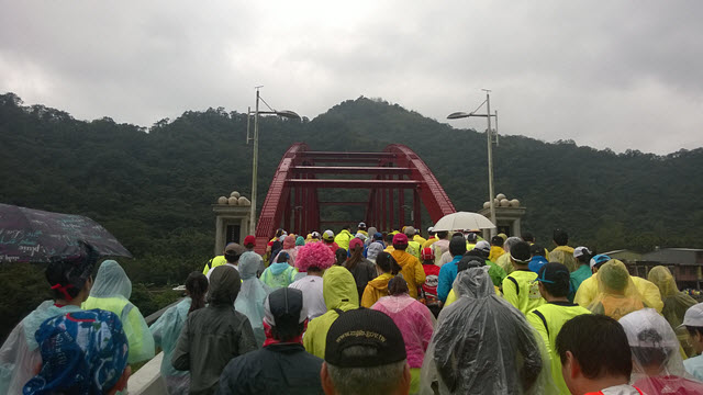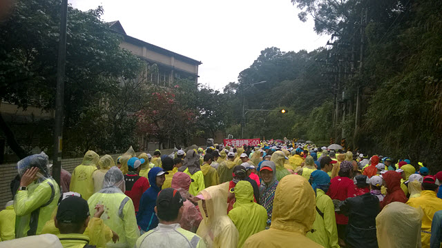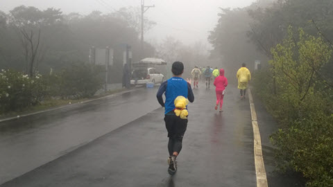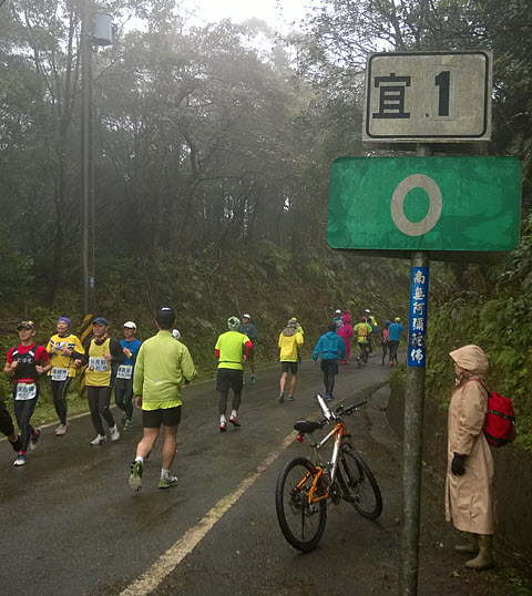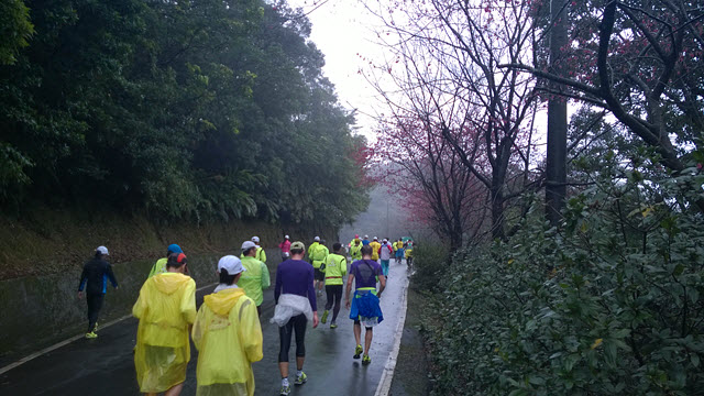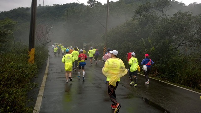 天氣濕冷,但雨勢不大,比起2012初馬那年來得小,證據是今年鞋子沒濕。基本上老天爺還是給了個不錯的跑馬天,但一路上很多時候會跑進雲裡。