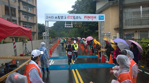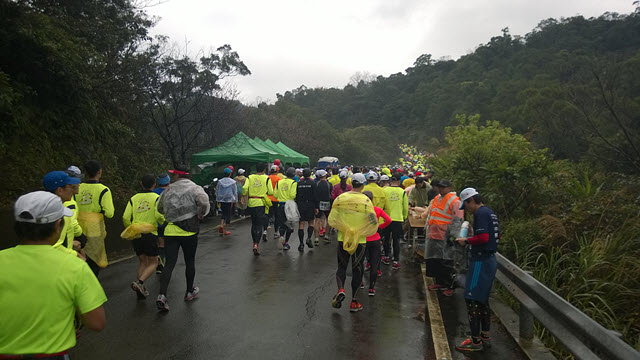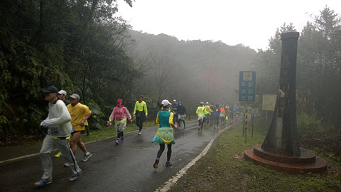 在補給站發生一件趣事。賽前大會報告提到配合濕冷天氣補給站備有熱食,便特別留意尋找。見到某帳篷前選手聚集處白煙裊裊,想必有熱食好料,擠進去看發現只有沙士汽水,哪來的熱食?再定神一看,才發現白煙是天冷跑者身上冒出的水蒸氣… 哈,笑翻了!(今年補給品有香蕉、橘子、77乳加、小餐包、小蕃茄、鹹蛋、沙琪瑪、薑茶、豆干、桂圓湯、味增湯、水、運動飲料、沙士、咖啡,我沒逐站細查,可能有漏)