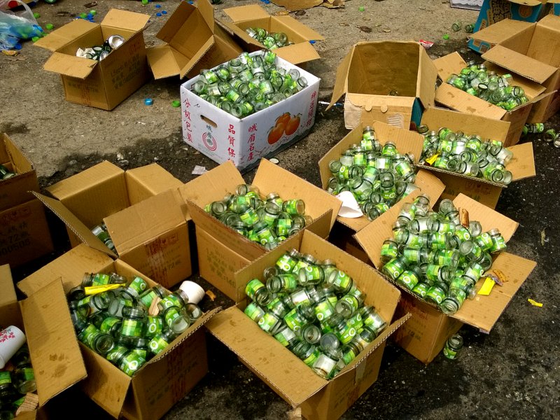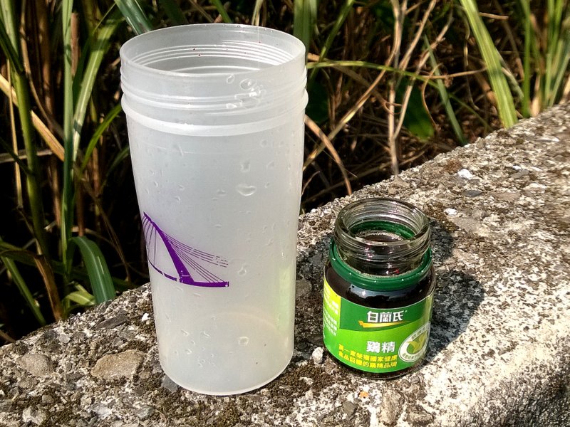 倒數的某個水站,只見滿地的雞精空瓶… 我們跑太慢,雞精發完惹,水站志工急中生智:「沒喝到沒關係,跑步喝雞精沒用啦」(哈)
