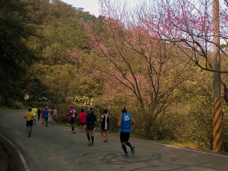 為配合火車時刻,櫻花馬照往例遲至8:30起跑,氣溫較高,但樂得睡飽一點也好。馬拉松跑多心態大不同,以前跑馬像出國,前一天就慎重地照Check List打包行囊,緊張到輾轉難眠;如今已如上菜市場,東西抓一抓就走,想想都覺好笑。