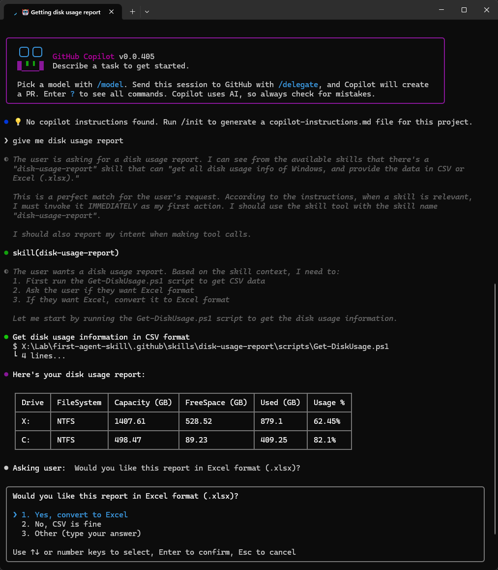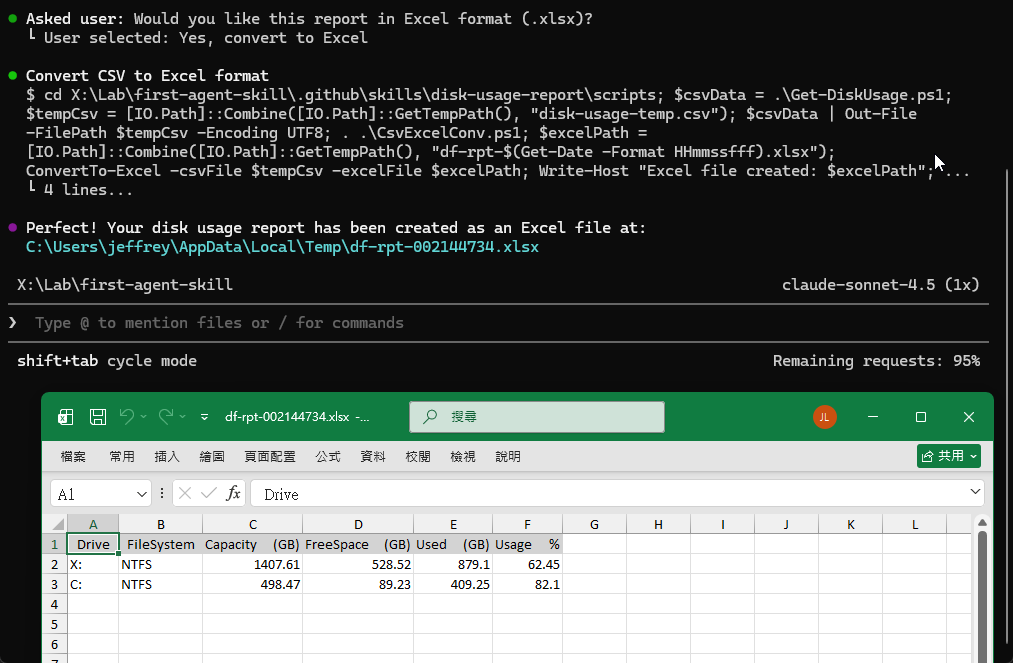 再來便是見證奇跡的時刻,在 Github Copilot CLI 中說我想要看磁碟使用狀況,Copilot 便會想到可以使用 disk-usage-report 這個 Skill,並聰明地調用它,將 CSV 轉成表格顯示,順便問我要不要轉成 Excel?