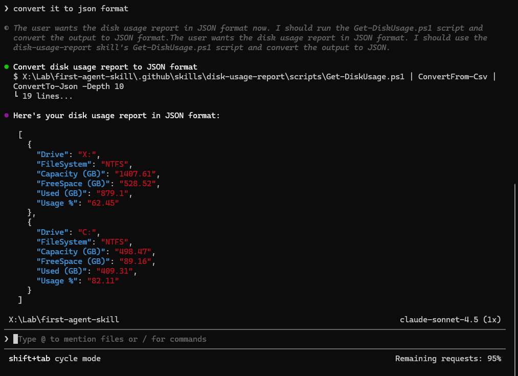 3. If user want JSON format report, run `scripts/Get-DiskUsage.ps1 | ConvertTo-Json` to convert CSV to JSON