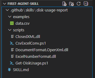 我借用之前寫的 PowerShell CSV / Excel 轉換函式,寫了一個查詢 Windows 磁碟空間使用狀況,並可轉成 Excel 報表的 Skill。