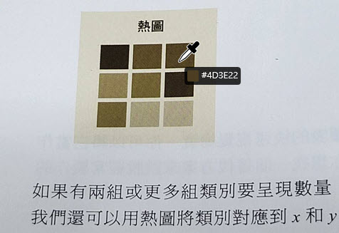 在書上看到圖表的配色我很是喜歡,想偷它的顏色來用。這工作說難不難,可以拍張照片,用繪圖軟體的取色工具採樣,把色碼記下來,但同樣動作要做九次,說起來也是有點小煩。