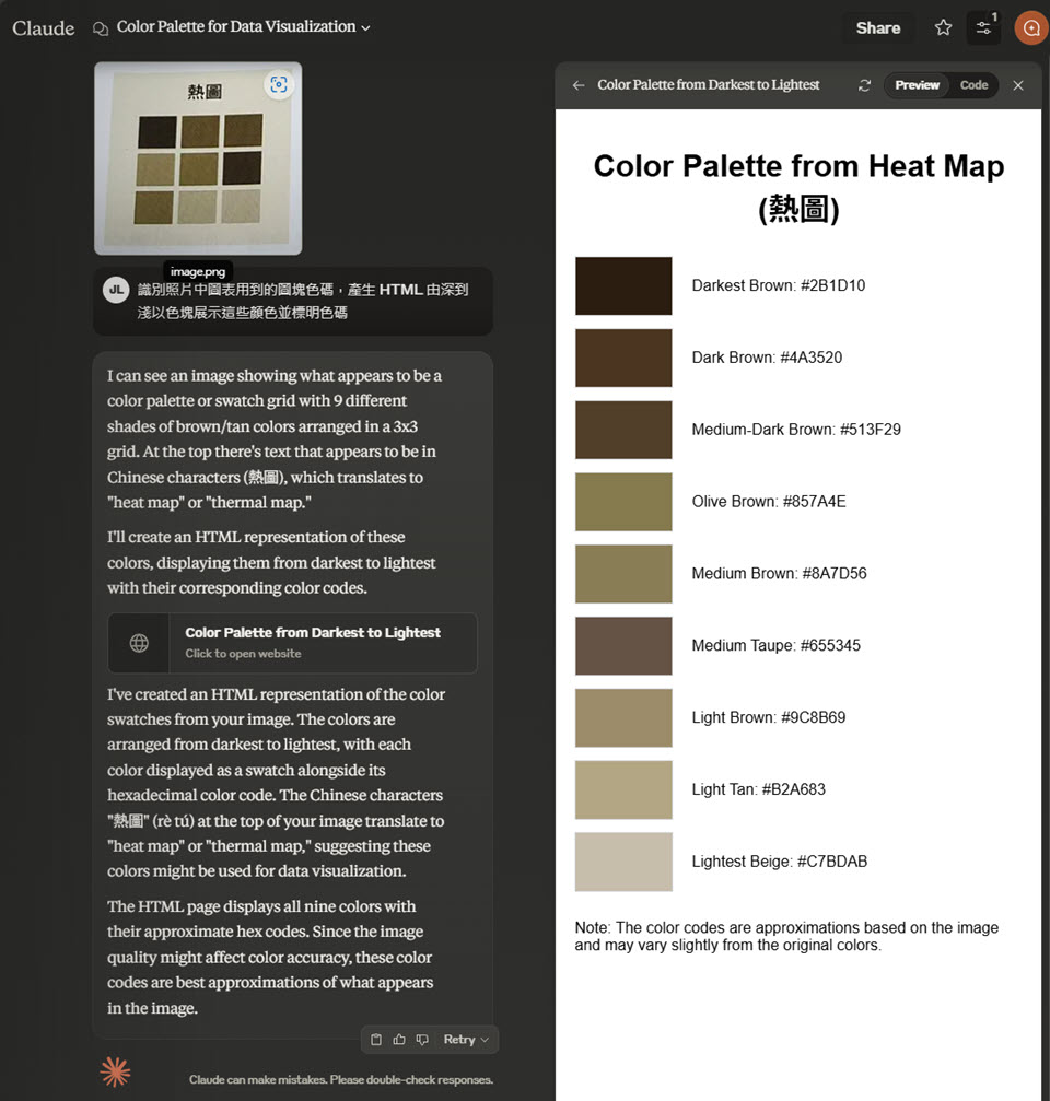 識別照片中圖表用到的圖塊色碼,產生 HTML 由深到淺以色塊展示這些顏色並標明色碼