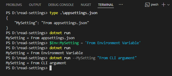 Console.WriteLine("MySetting = " + config["MySetting"]);
