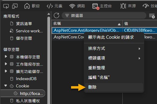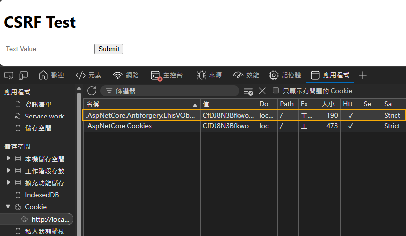 使用 F12 開發者工具也可觀察到 ASP.NET Core 自動產生名為 .AspNetCore.Antiforgery.<編碼值> 的 Cookie: