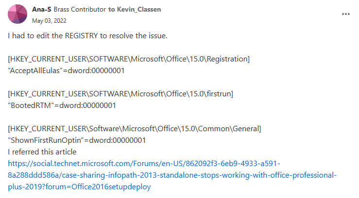 先用關鍵字找到一則討論,2022 起便有相似問題通報,有網友提供解藥一劑,參考 InfoPath 2013 類似問題解法,修改三個 Registry 可藥到病除,該解方經兩位網友留言證實有效。