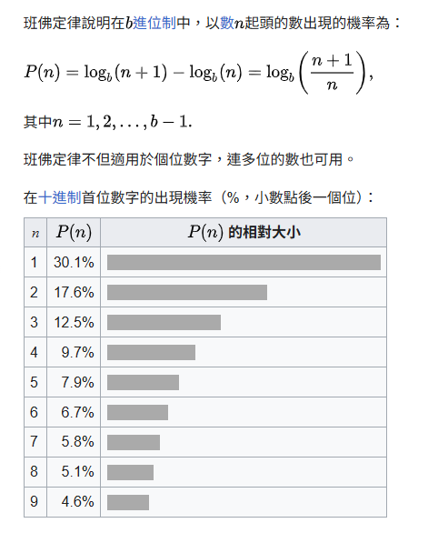 事實不然,依據「班佛定律」,舉凡人口、土地面積、河川長度,乃至影片文章的點閱數,這些自然形成的數字,只要筆數夠多,統計下來 1 開頭的機率多半超過 30%,其次是 2 的17.6%,一路到 9 下滑。