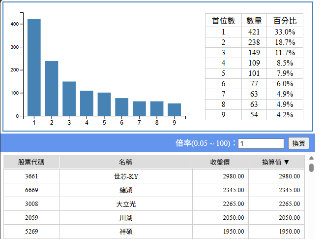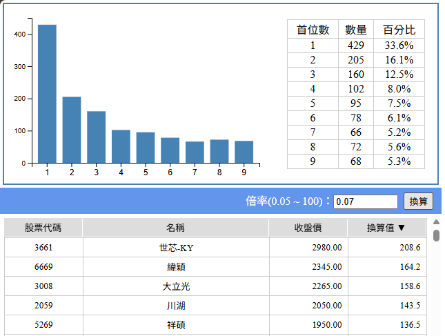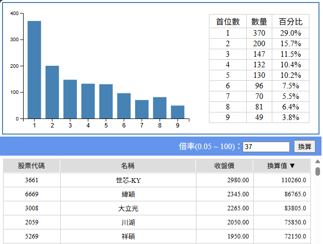網頁有個倍率換算功能,允許輸入倍率數字將所有收盤價乘上此倍率得到換算值,再統計換算值的第一位數字。換言之,若乘 37,10 元會變成 370,原本十幾元的股票會變成 37 到 73 元之間,但神奇的是,乘完 1 還是最多,佔 29%: