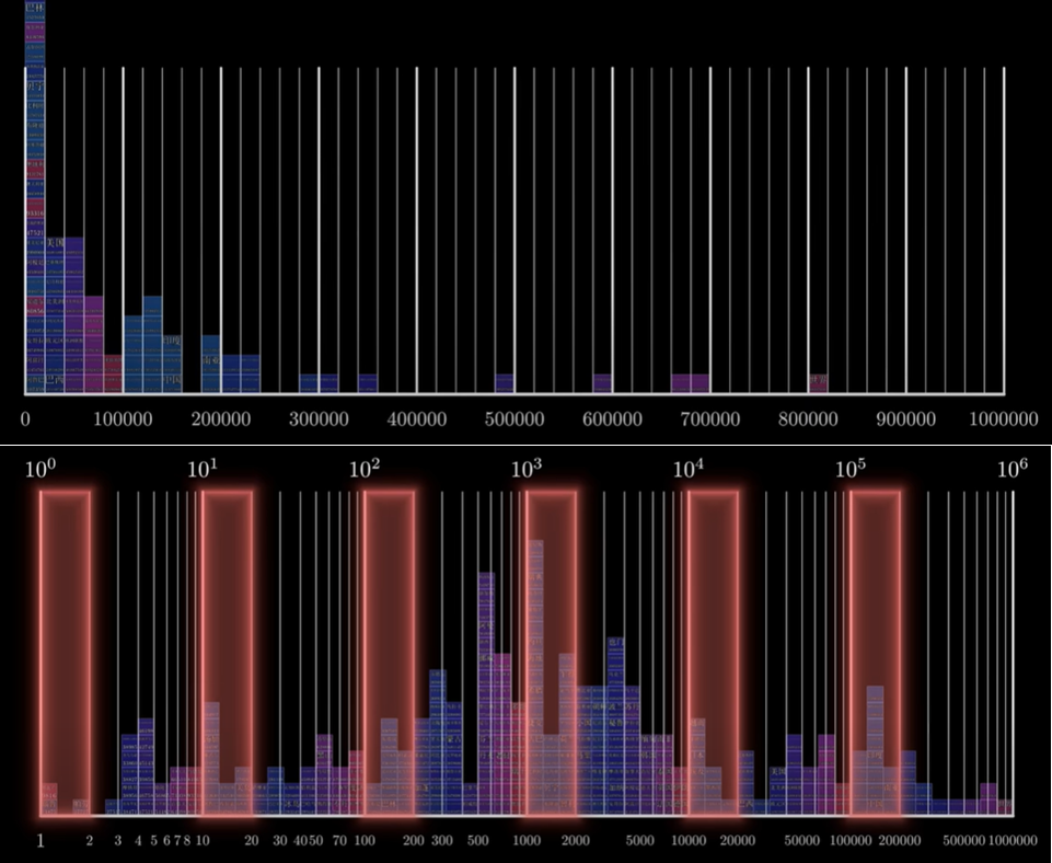 將長尾分布數字進行 Log 計算,會轉成常態分佈。如下圖,各圖人口數量統計原本高度集中於左側,呈現長尾分佈,下方的圖是轉 Log 10 後的結果(單位為萬人),中央最多兩側較少,接近常態分佈。而在對數 X 座標軸,1 到 9 刻度的寬度並不相等,紅色區域為 1 的範圍,佔掉總寬度近 1/3。人口數從 0 到 106 都有,佔有近 1/3 的 1 自然成為第一位出現機率最高的數字,且其比例接近 30%。