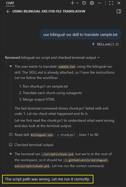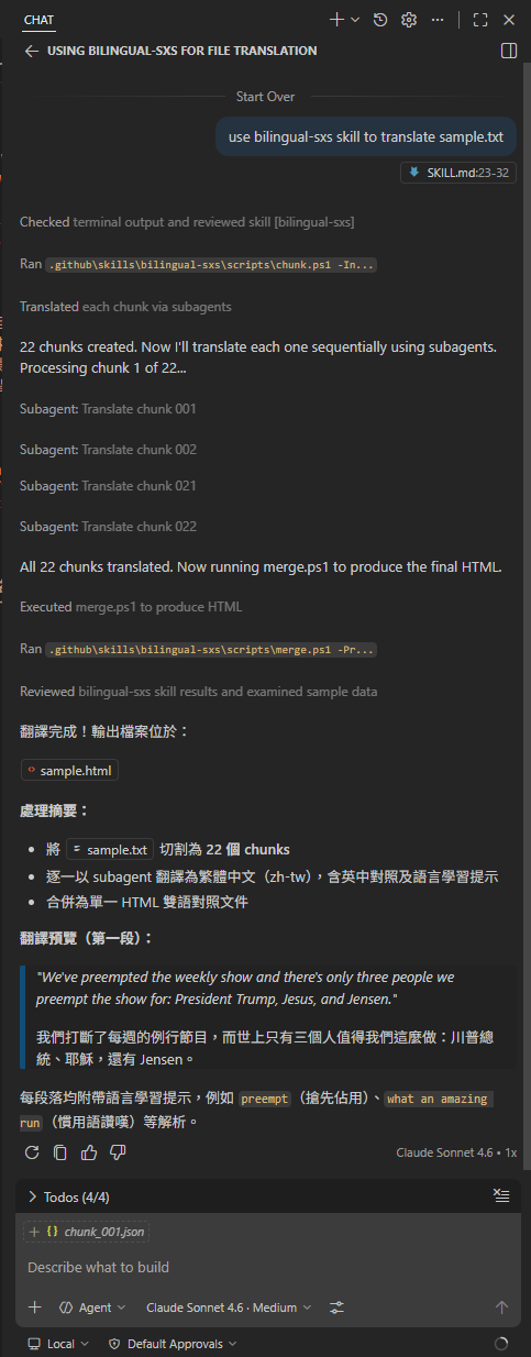 若大家有興趣參考 Agent Skill 寫法或想實際玩玩,我把程式放上 Github 了,若有 Github Copilot 可 Clone 回去用 VSCode 開啟,用一句提示 use bilingual-sxs skill to translate sample.txt 即可將範例文字檔翻譯成中英對照好讀版。操作說明 (註:README.md 是我請 Copilot 生成的,坦白說寫得真好,我絕對沒耐心與時間寫出此等友善的說明文件)