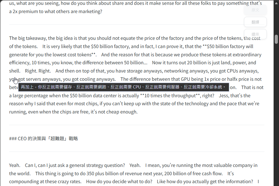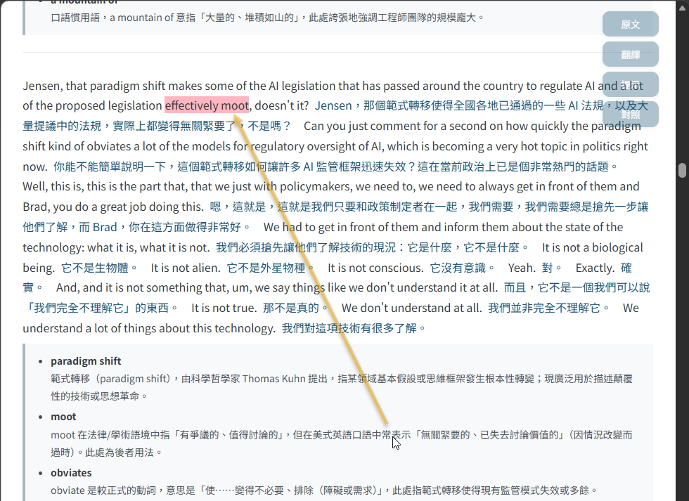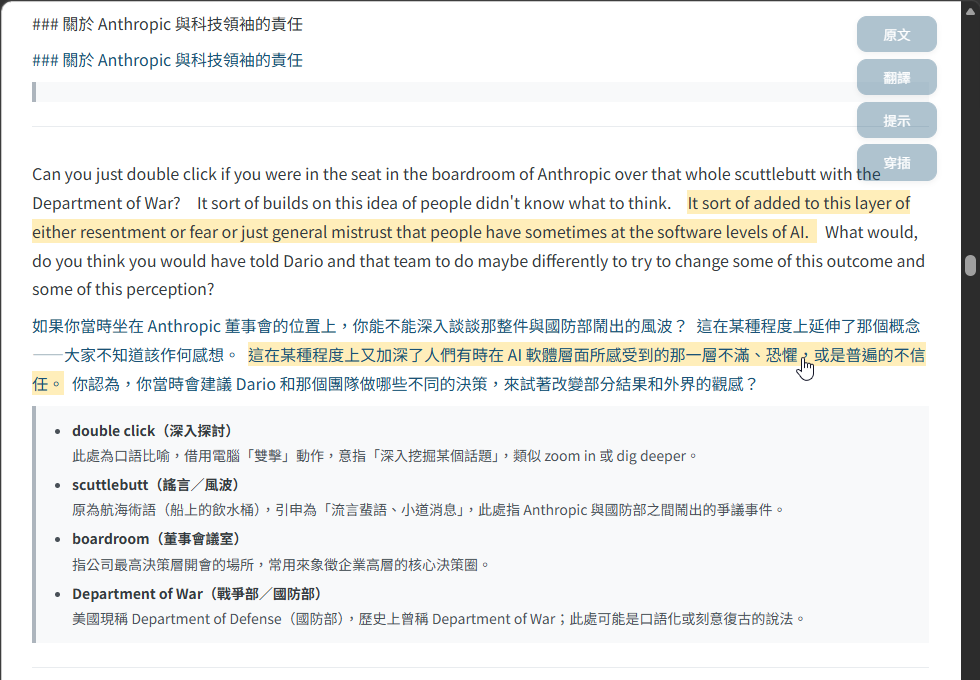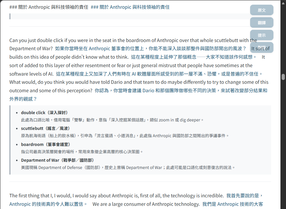 有先試了 NotebookLM 整理重點,AI 的濃縮重點有些跟我觀注方向不同,需要反覆追問挖掘,次數一多,Interative Tax 人機互動稅開始高到不如自己看原文。嫌直接看原文太吃力,我想要有中文翻譯,最好還能順便學英語,索性來做個想很久的小工具,一勞永逸解決類似問題。