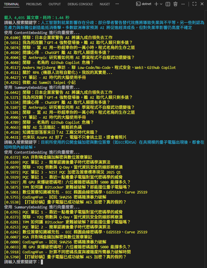 簡單實測一下,由於我是用整篇文章計算 Embedding,丟入一段文字找相關文章最能展現向量相似度搜尋的威力。例如:我分別丟入一段 「AI 影響就業」以及「量子電腦威脅密碼學」的描述,搜尋結果的相關度極佳,這是傳統全文檢索很難辦到的: