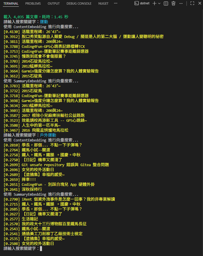 以下為包含建立 InMemoryVectorStore、讀入 JSON、建立摘要及 Embedding、將物件寫入 VectorStoreCollection,輸入搜尋文字,分別比對 ContentEmbedding、SummaryEmbedding 找出最相關的文章... 等一連串作業:(順便得到統計數字,從 2004-01-10 到 2026-04-25,我已經寫了 4025 篇文章,廢話真不是普通的多啊~~~)