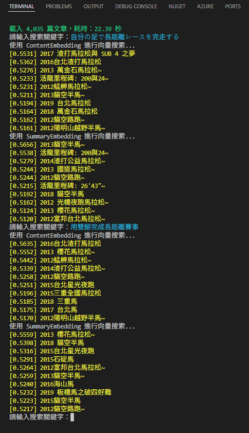 最後這個測試完美展現傳統全文檢索難以實現的效果,我輸入一段日文「自分の足で長距離レースを完走する」(中文意思是「用雙腳完成長距離賽事」),用另一種語言又換句話說的方式,仍能成功查到馬拉松文: