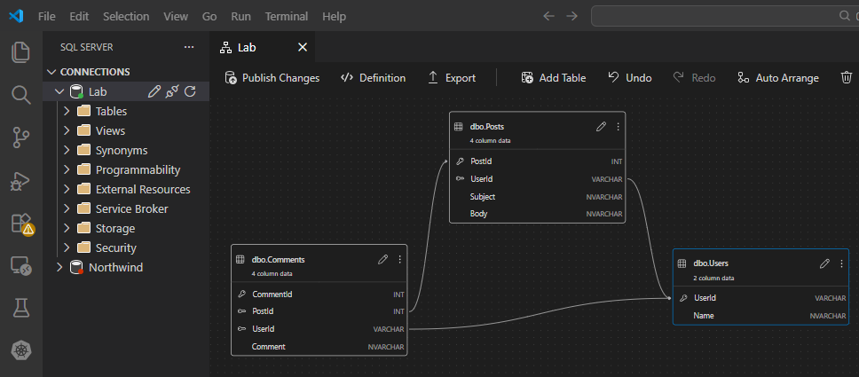 用一個簡單例子示範。我在 SQL 建了三個資料表,分別儲存文章(Posts)、留言(Comments)與使用者(Users)資料,三者的 PK 為 PostId、CommentId 及 UserId,另外有三個 FK 關聯,Comments.PostId 指向 Posts.PostId、Posts 及 Comments 都有 UserId 指向 Users.UserId: