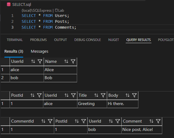 INSERT INTO Comments VALUES (1, 1, 'bob', N'Nice post, Alice!');