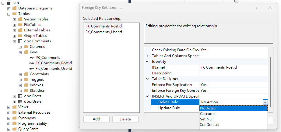 我先清空 Posts 與 Comments,接著插入一筆 Post 一筆 Comment,然後直接刪除 Post。刪除先檢查 FK_Comments_PostId 的 ON DELETE 設定。