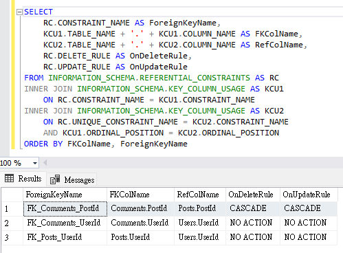 設定 FK_Comments_PostId ON DELETE CASCADE ON UPDATE CASCADE,就能直接執行 UPDATE Posts SET PostId = 2 WHERE PostId = 1、DELETE FROM Posts WHERE PostId = 2,SQL 會自動更新或刪除 Comments。
