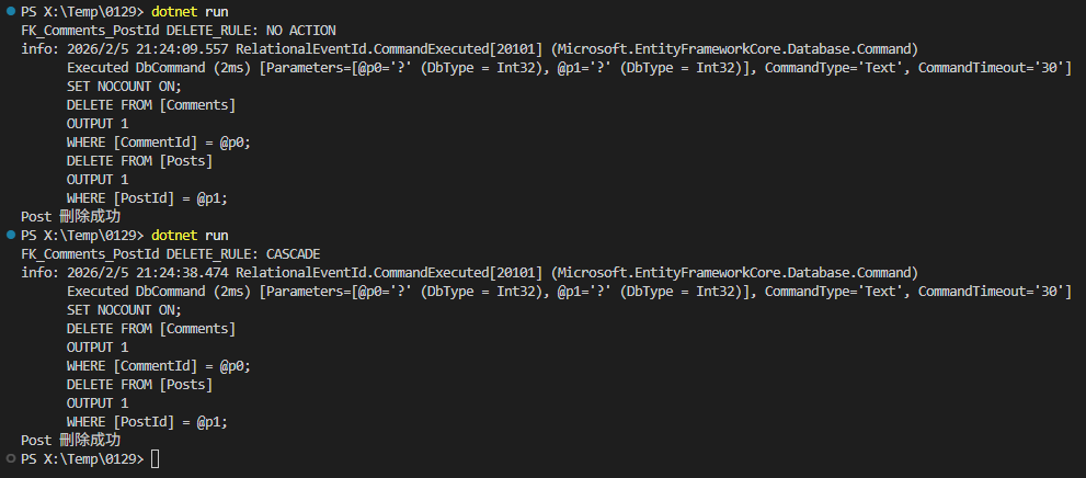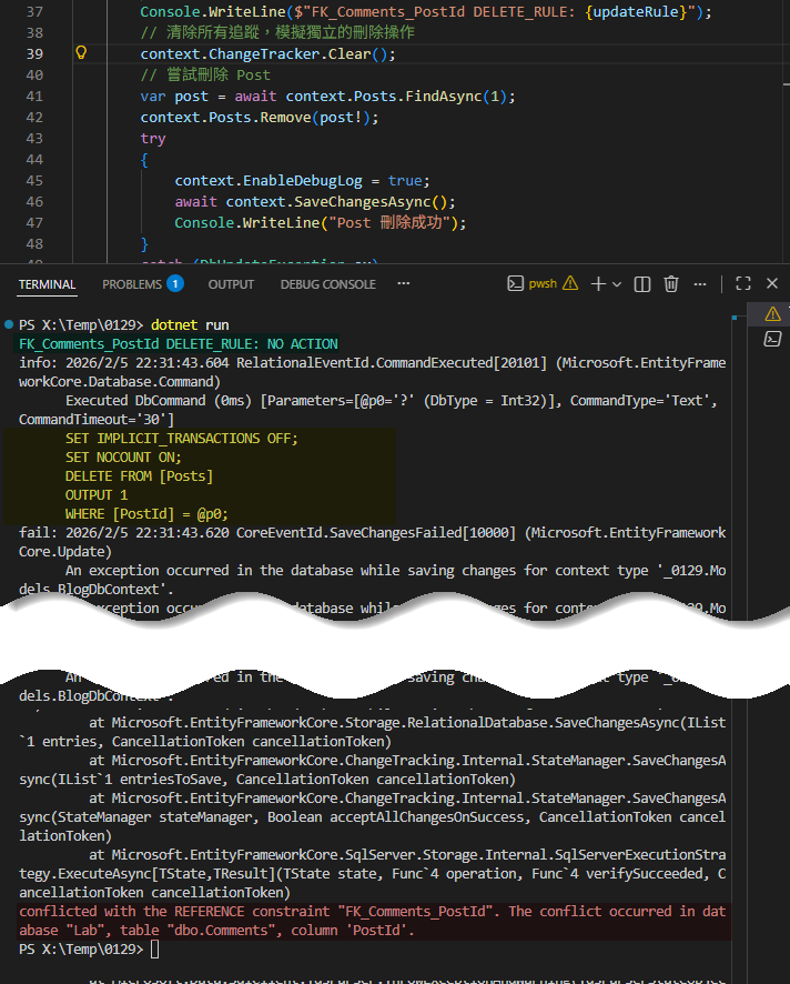 在這個實驗中,由於我們插入 Post 跟 Comment 後隨即刪除剛插入的 Post,此時 Post 跟 Comment 都在 EF Core 追蹤範圍內,因此 EFCore 會產生兩個 DELETE 指令,先刪除 PostId = 1 的 Comment,再刪除 PostId = 1 的 Post;即便 FK_Comments_PostId 設定 ON DELETE CASCADE,EF Core 仍會在模型端自行刪除關聯項目,不依賴 DB 端的 Trigger 行為。