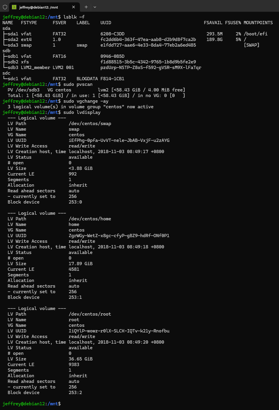用 lsblk -f 可看到 CentOS 的磁碟在 /dev/sdb,但 CentOS 有啟用 Logical Volume Manager, Version 2 (LVM2),真正放資料的分割被包在 /dev/sdb3 裡,因此我們需要先 sudo apt-get install lvm2 在 Debian 安裝 LVM2,執行 pvscan、vgchange -ay 啟甪 LVM2,之後 lvdisplay 會列出真正的分割分別為 /dev/centos/swap、/dev/centos/home 及 /dev/centos/root: