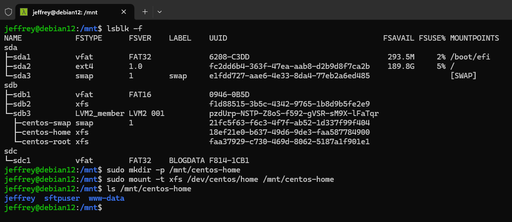此時再執行 lsblk -f 可以看到 LVM2_member 的三個分割及其檔案系統型別,之後便可以 mount 到 /mnt/ 下,查看內容: