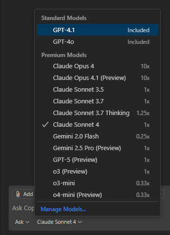 選擇模型除了效果、速度,費用也是一大重點,所以開始前先簡單介紹 Github Copilot 的模型計費方案。