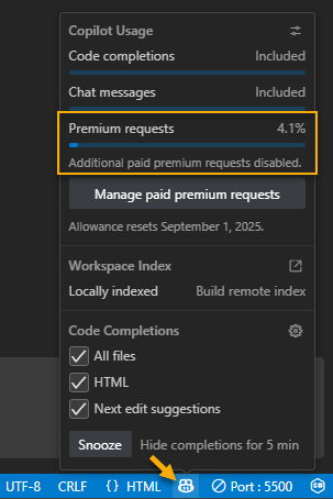 滑鼠移到 VSCode 右下角的 Copilot 圖示上,浮現視窗有個 Premium Requests 已看進階請求已使用的百分比。