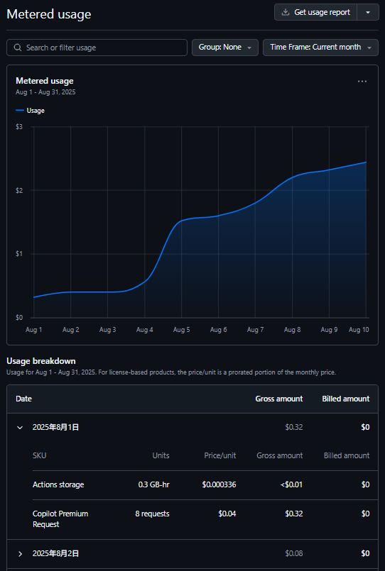 Github 網站的個人帳單/使用量報表也可以查到每天進階請求使用次數。
