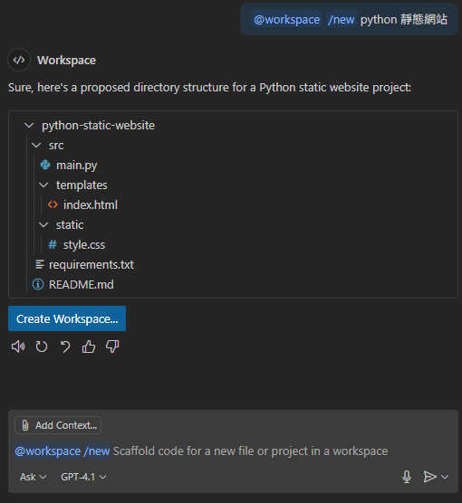 例:/new README.md(會自動補上 @workspace)、/new python django 網站依要求試著建立專案,可先預覽生成結果