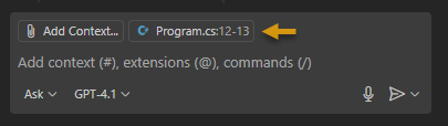 Copilot Chat 輸入欄會自動帶入你正在編輯的檔案、選取的行數範圍,旁邊有 【Add Context...】 鈕可以選取增加,但有時更快的做法是用 # 變數在提示中加入特定上下文。