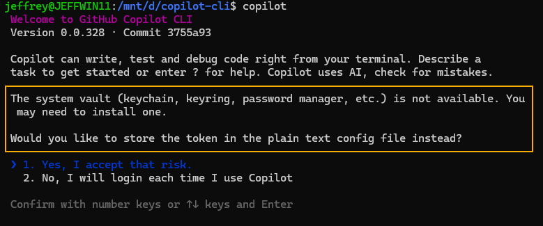 使用 /login 完成 Github 帳號登入後,Copilot CLI 問我,因為沒設機密資料保險箱,是否同意用明碼儲存 Token。我知道這種情況很多人會秒選同意,完全不影響使用...