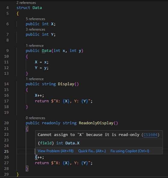 在 C# 8 之前可以宣告public readonly struct StructName將整個結構宣告為唯讀,C# 8.0 可只將特定成員方法/屬性/索引子/覆寫 System.Object 方法(例如:ToString())宣告為唯讀。 在編譯階段阻止對結構內容的不當修改,例如以下的例子,Display() 可以 X++,在 ReadonlyDisplay() X++ 會產生編譯錯誤: