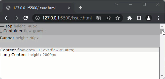 然而,實際排版還有些額外要求,.main 要先分成 .top (固定高度 40px) 及 .container (吃滿剩餘頁面高度),.banner 及 .content 則搬進 .container 內,.container 的高度扣除 .banner 固定高度 40px,餘下都留給 .content 顯示可垂直捲動的超長清單。(註:真實案例比這個更複雜些,因為有水平方向的排版要求,無法簡化將 .top 40px、.banner 40px、.content flex-grow: 1 放在同一層縮放,只能寫成巢狀,這個範例為可重現問題的簡化版本)