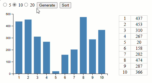 於是,我試著用 D3.js 做了簡單的網頁長條圖當成練習,顯示由亂數產生的 5、10 或 20 筆資料;網頁並支援簡單互動操作,滑鼠滑過長條時右側表格的對應項目會變色;反之,當滑鼠滑過表格數字,對應的長條也會變色。