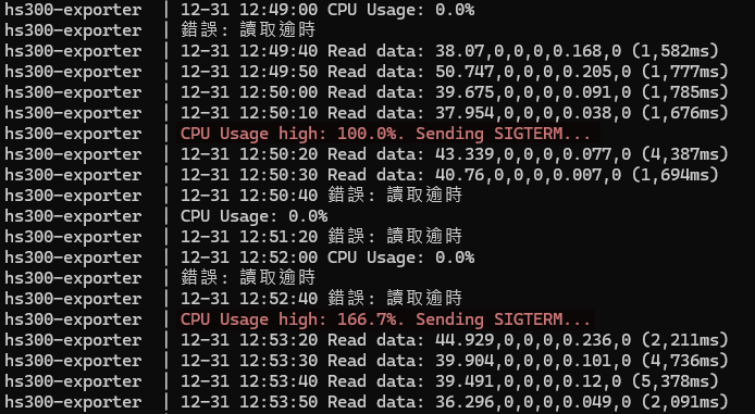 如圖表所示,在 12/13 啟動每五小時自動重啟後,還是出現兩次 CPU 飆到 150%+ 的記錄,推測 TPLinkSmartDevice 程式庫比想像中還不穩定,有時重啟後沒多久便開始吃 CPU,如此 CPU 將一路飆高數小時直到下回重啟。