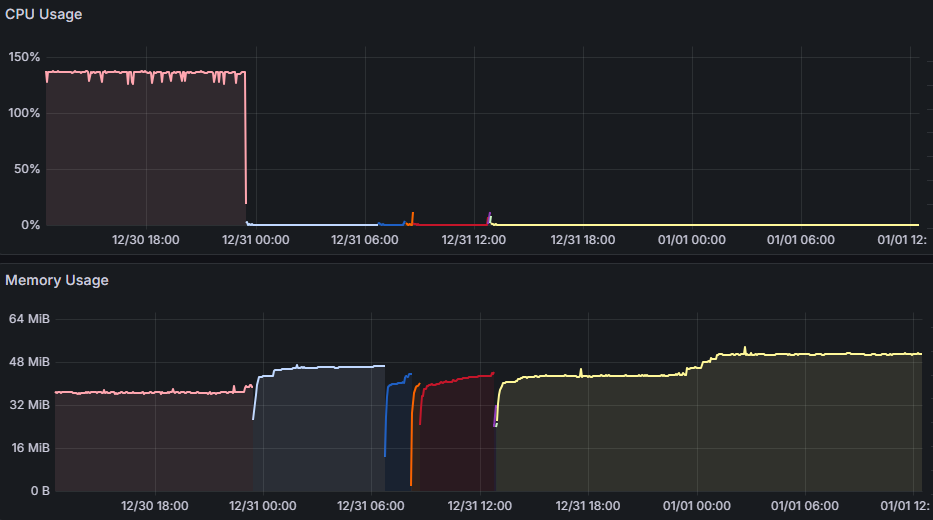 由 Grafana 圖表,健康檢查版在 12/30 午夜上線,之後出現多次 CPU 微幅突起、Memory 曲線換色且不連續,可驗證 CPU 衝高觸發的容器重啟確實有效。歷時兩個月的努力,終於磨出一套令人滿意的解決方案,也對 Docker 健康檢查機制有了基本認識,滿足。