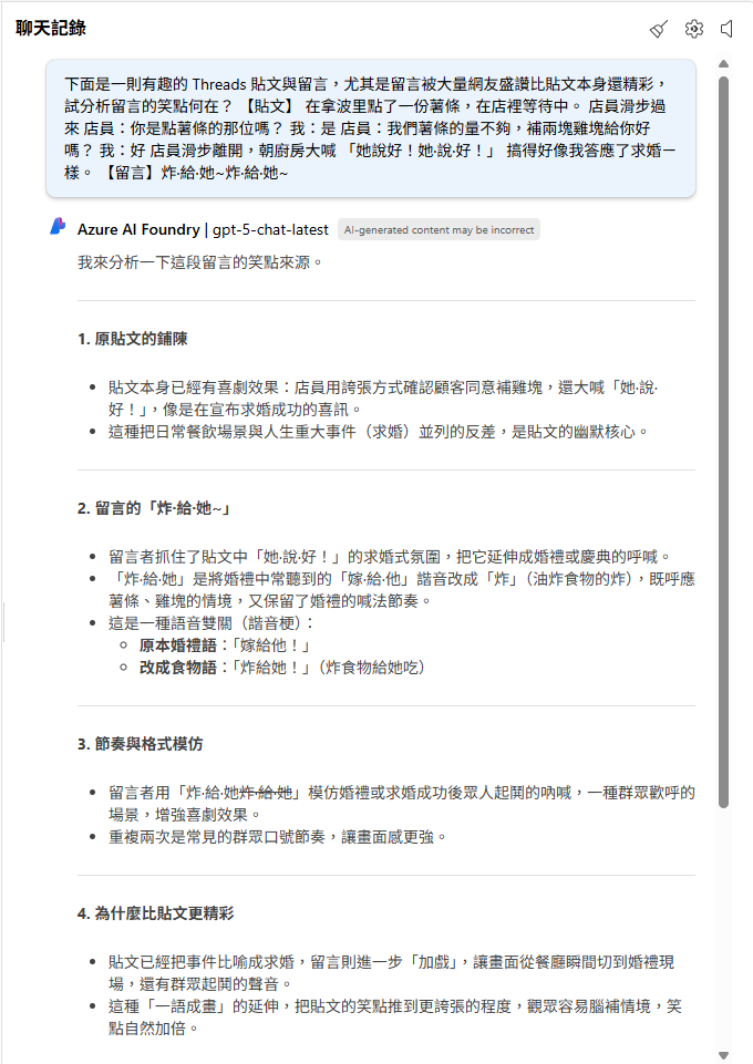 但在我的想像中,這個模型只能做到一天到晚出諧音梗讓你想翻白眼,但又確實有點好笑的那種程度吧(我沒有舉例星期天跟蔡哥),要做到令人拍案叫絕的脫口秀水準有點困難。畢竟 LLM 的生成結果靠訓練資料,專長是運算出最能討好人類的排列組合,而我們之所以覺得精彩好笑,往往源自結果出乎意料,正是訓練過程不會出現的東西。
