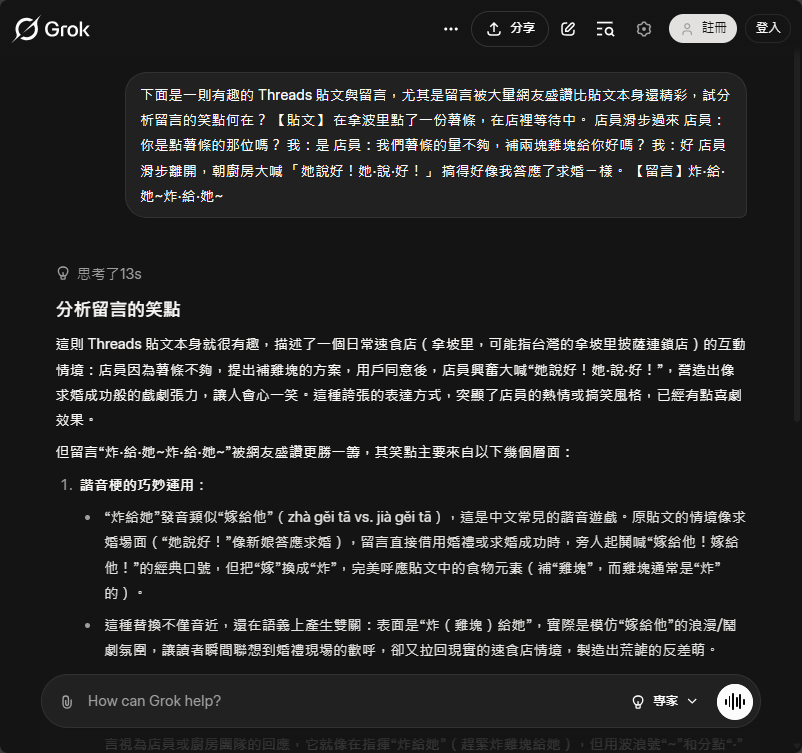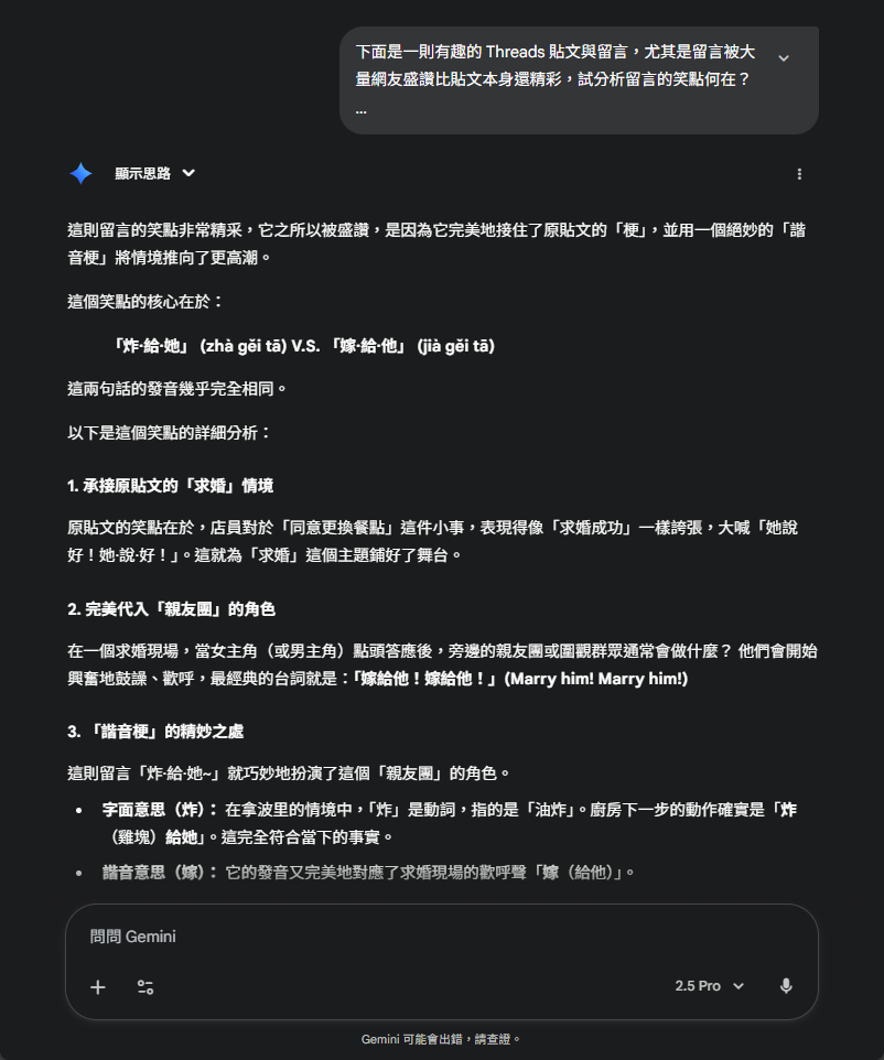 我在這裡非常負責任地跟大家報告,是的,目前 Gemini、GPT 跟 Grok 的高級模型通通都有能力看懂中文諧音梗了。(登楞!)
