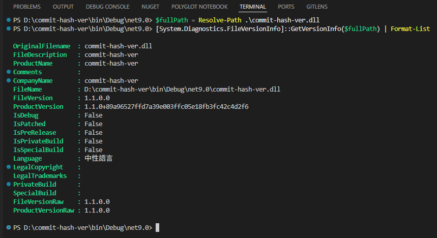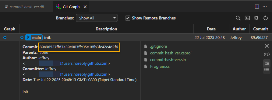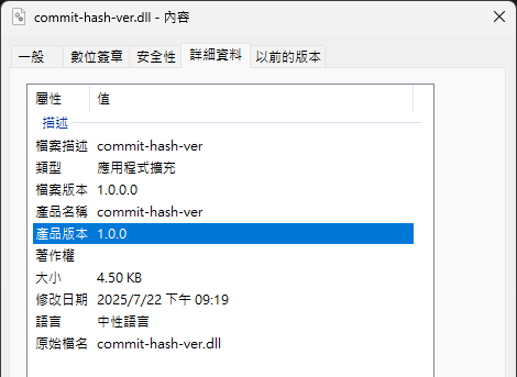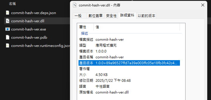 從 .NET 8 開始,若專案有加入 Git 版控,SDK 在編譯組件時預設會自動在版號後方加上 Git Commit Hash。如下圖,我用 .NET 9 隨意建置一個 Console 程式,DLL/EXE 的產品版本欄位在版號數字後方會有一串 16 進位數字: