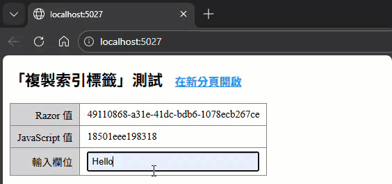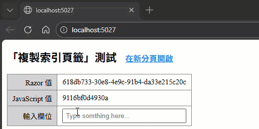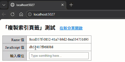 若使用複製分頁方式,可發現 Razor 值(伺服器端產生)及使用者輸入內容相同,僅 JavaScript 值會在每次顯示網頁時重新產生而不同: