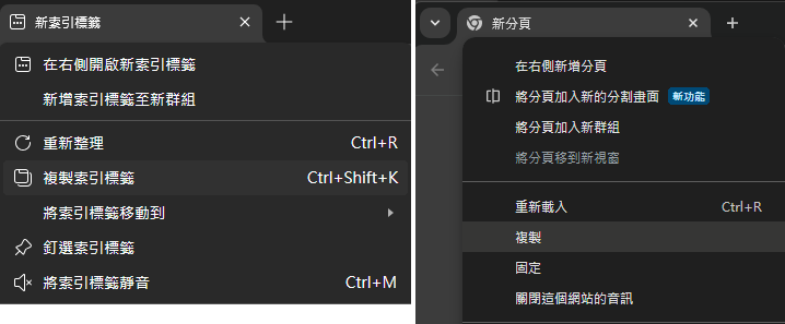 接獲使用者通報才知 Edge 跟 Chrome 有個我沒用過的功能 - 「複製索引標籤」(Edge,下圖左)/「複製」分頁 (Chrome,下圖右)。