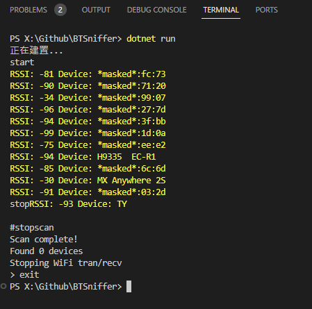 測試成功,有掃到藍牙狀置。但我發現它是以電腦或手機的角度去尋找可用藍牙裝置,不是我所想像會攔截看到的封包,故可能還是買 nRF 模組配合 Wireshark 會比較方便。
