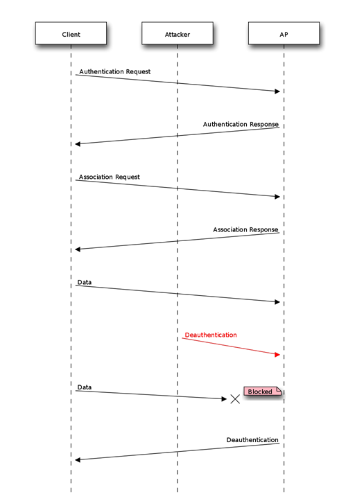 補充了一下資安知識,這種攻擊手法叫 Wi-Fi Deauthentication Attack,原理是攻擊者假冒受害客戶端 MAC 網址,向 Access Point 送出 802.11 協定中的 Deauthentication Frame,告知其已切斷連線,之後受害客戶端傳送的資料會被拒絕,AP 也會向其發出 Deauthentication 通知,屬於一種 Deny of Service (DoS) 攻擊。
