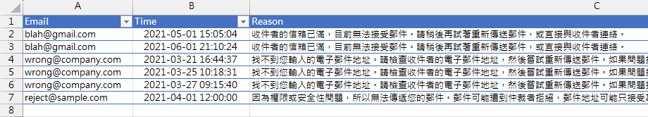 產生的 CSV 如下,同一 Email 的多次退信記錄列在一起,方便快速 Email 是一時信箱滿了還是地址有錯,亦或為亂填的髒資料,再決定要如何處置。