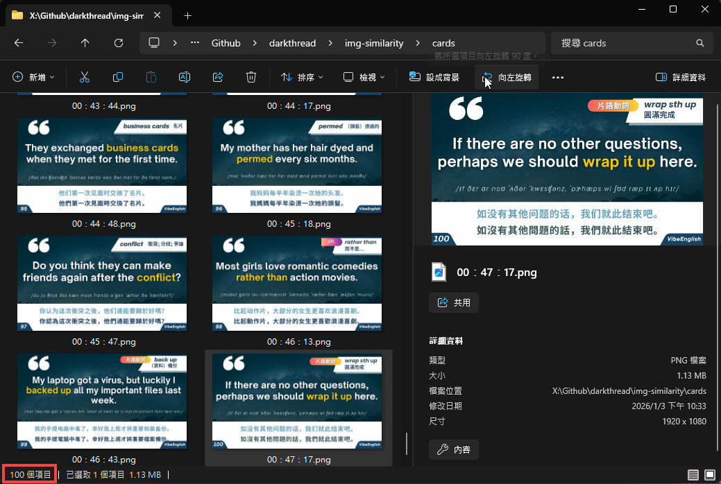 實測使用 DifferenceHash、PerceptualHash 或 AverageHash 都能正確識別所有 Listen 畫面並挑出 100 張例句卡片,這個案例中看不出三種演算法的速度差距,猜測是因為圖片偏大(超過 1MB),瓶頸出現在資料 IO,而在相關研究中,pHash 速度明顯較慢。