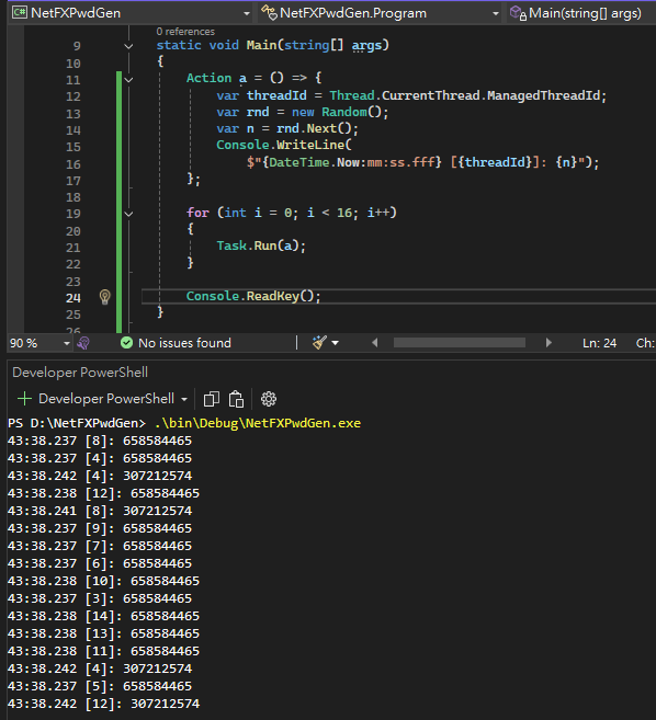 在資訊安全中,隨機數的品質往往決定其密碼學安全性,一旦不夠隨機或可被預測,代表攻擊者只需嘗試可能出現的組合,破解難度會降低。System.Random 並不符合密碼學對隨機性的嚴格要求,不信的話請看以下示範,以 .NET Framework 為例,Random 預設是用 Environment.TickCount 當種子,故同時用多 Thread 跑 new Random() 的種子相同,產生的隨機數也相同: