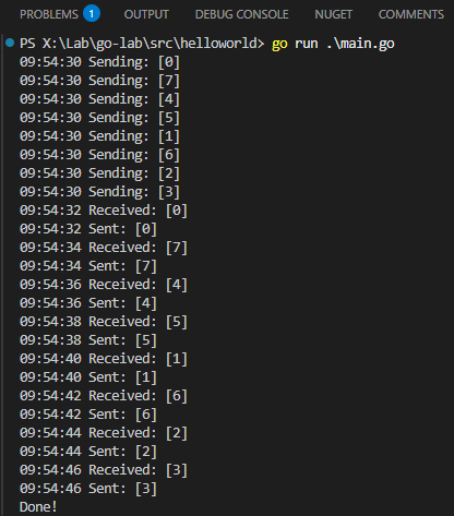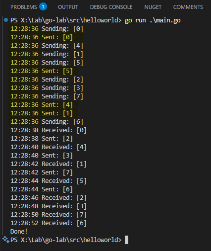 結果顯示,一開始 0 ~ 7 的 Sending 同時出現,屬非同步平行處理;而 Sent 則每隔兩秒才顯示一筆,證明 ch <- message 會被 recv := <-ch 卡住,採同步化執行。